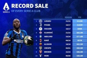 意甲各隊(duì)出售球員標(biāo)王排名(只選取各隊(duì)最高轉(zhuǎn)會費(fèi),每隊(duì)一人):