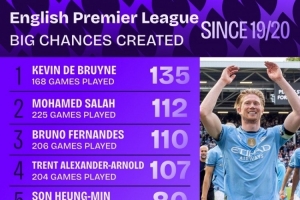 體育資訊11月19日訊 Squawka統(tǒng)計了2019-2020賽季以來球員在英超創(chuàng)造重大機會的次數(shù),并列出榜單,德布勞內、薩拉赫、B費排名前三位。