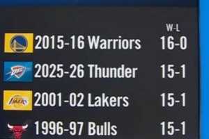 值得注意的是,過去30年開賽季前16場至少15勝的衛(wèi)冕冠軍中,2001-02賽季的湖人(15勝1負(fù))和1996-97賽季的公牛(15勝1負(fù))都奪冠了。