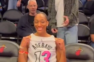 賽前,阿德巴約女友、本賽季W(wǎng)NBA總冠軍并包攬DPOY、MVP和FMVP的阿賈·威爾遜身穿男友球衣現(xiàn)場觀戰(zhàn),前后反穿專門露出阿德巴約的名字與號碼。
