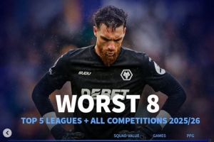 體育資訊11月21日訊 五大聯(lián)賽即將重燃戰(zhàn)火,《轉(zhuǎn)會市場》統(tǒng)計(jì)了本賽季至今五大聯(lián)賽球隊(duì)的各項(xiàng)賽事場均拿分最少情況,英超的狼隊(duì)以場均0.57分墊底。