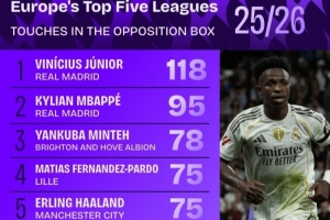 體育資訊11月21日訊 五大聯(lián)賽戰(zhàn)火即將重燃,數(shù)據(jù)機構(gòu)squakwa也統(tǒng)計了本賽季至今的五大聯(lián)賽球員在對方禁區(qū)內(nèi)觸球次數(shù)情況,維尼修斯力壓隊友姆巴佩居首。