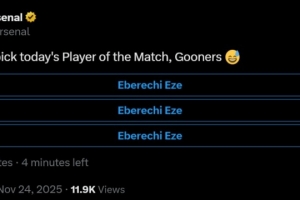 賽后阿森納官方在社媒發(fā)布投票,評選本場最佳球員,三個(gè)選項(xiàng)均為上演帽子戲法的埃澤。