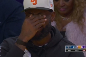 GIF-克萊伯上籃被籃筐帽了 詹姆斯在場邊捂臉笑不停