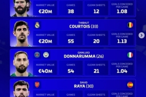 庫爾圖瓦(皇馬,33歲,比利時(shí)):身價(jià)2000萬,55場,20零封,場均丟1.13球
