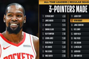 本場(chǎng)比賽,杜蘭特達(dá)成兩項(xiàng)里程碑,除了生涯突破31000分外,他的三分命中數(shù)(2223)也超過賈馬爾·克勞福德(2221),獨(dú)享歷史第12名。
