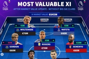 前鋒:安東尼·戈登(紐卡,6000萬(wàn)歐)、沃爾特馬德(紐卡,7000萬(wàn)歐)、馬特塔(水晶宮,4000萬(wàn)歐)、塞梅尼奧(伯恩茅斯,6500萬(wàn)歐)
