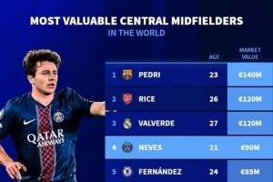 體育資訊12月13日訊 德國轉會市場統(tǒng)計了中場中路球員(CM)的德轉身價,并列出榜單,佩德里1.4億歐居首。