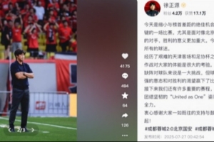體育資訊7月27日訊 中超聯(lián)賽第18輪,成都蓉城主場2-0擊敗北京國安。賽后,蓉城主帥徐正源更新了個人社交媒體。