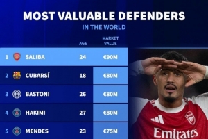 體育資訊12月15日訊 德國轉(zhuǎn)會市場列出了后衛(wèi)身價排名,薩利巴9000萬歐居首。