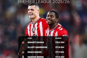 3、諾亞·薩迪基(桑德蘭),177.7公里