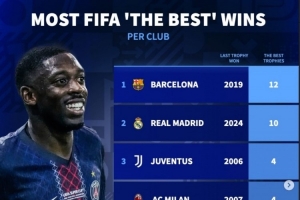 體育資訊12月17日訊 FIFA年度頒獎典禮結束,登貝萊獲FIFA年度最佳球員,德轉列各俱樂部球員獲FIFA年度最佳球員次數(shù),巴薩12次居首,皇馬10次第二,尤文、米蘭、國米、巴黎4次并列第三。