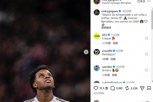 羅德里戈賽后社媒寫道:“‘風雨過后,陽光總會重現(xiàn),保持信念????’感謝伯納烏,2026年再見。”