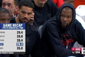 杜蘭特今天目前得到31分,最后時(shí)刻又回到場上,場均得分可能還會上漲。