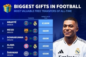 體育資訊12月26日訊 德國(guó)轉(zhuǎn)會(huì)市場(chǎng)統(tǒng)計(jì)了足壇歷史免簽球員的身價(jià),并列出榜單,姆巴佩1.8億歐居首,梅西8000萬(wàn)歐次席。