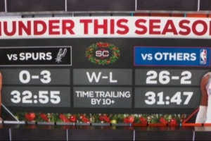 雷霆賽季至今打馬刺:0勝3負(fù) 落后兩位數(shù)時(shí)間32分55秒