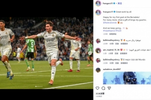 他也在賽后通過(guò)社媒曬出自己的慶祝照,并配文:“大家做得太棒了!我很開(kāi)心收獲自己在伯納烏球場(chǎng)的首球!希望以后還能進(jìn)更多球,這真是份超棒的圣誕禮物,感謝我的朋友@巴爾韋德??????繼續(xù)前進(jìn)…… ??????”