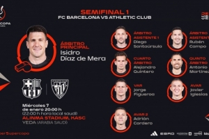 體育資訊1月6日訊 西班牙足協(xié)公布了西超杯的裁判安排,德·梅拉執(zhí)法巴薩vs畢巴,馬特奧·布斯克茨執(zhí)法皇馬vs馬競。