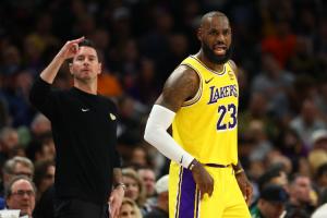 賽后,湖人主帥雷迪克接受了記者采訪。他打趣道:“有時候勒布朗會叫我滾開(Fu** off ),然后他自己叫戰(zhàn)術(shù)?!?/p>