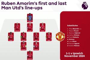 體育資訊01月07日訊 英超官方社媒曬圖,對(duì)比了阿莫林執(zhí)教曼聯(lián)首戰(zhàn)和最后一戰(zhàn)的首發(fā),并且發(fā)問(wèn):“你注意到什么了?”