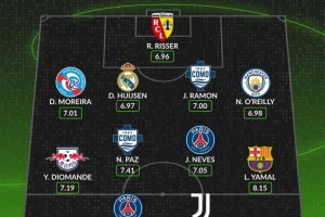 中場:帕斯(科莫,7.41分)、若昂·內(nèi)維斯(巴黎圣日耳曼,7.05分)、揚·迪奧曼德(萊比錫紅牛,7.19分)、亞馬爾(巴塞羅那,8.15分)