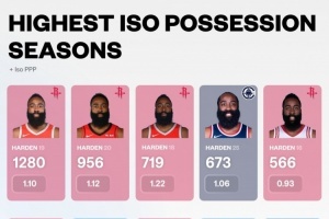 體育資訊8月2日訊 今天,美媒NBA University曬出了過去10年單賽季單打次數(shù)榜前10,哈登6次上榜。