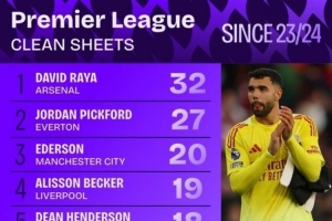 體育資訊9月25日訊 自2023-24賽季以來的英超門將零封榜出爐,阿森納門將拉亞以32場零封第一,皮克福德、埃德森分列二三。