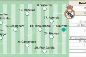 據(jù)《阿斯報》預(yù)測首發(fā)為:庫爾圖瓦;巴爾韋德、勞爾-阿森西奧、赫伊森、弗蘭-加西亞;瓊阿梅尼、卡馬文加、塞巴略斯、貝林厄姆;迪亞斯或貢薩洛、維尼修斯或羅德里戈。