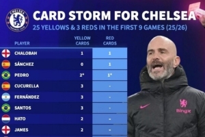 黃牌方面,庫庫雷利亞、恩佐和桑托斯是隊(duì)內(nèi)得牌最多的球員,均為3張。哈托、里斯-詹姆斯和喬治則各有2張黃牌入賬。此外,包括查洛巴在內(nèi)的七名球員各領(lǐng)到1張黃牌。