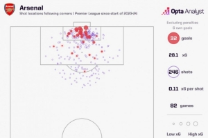不包括烏龍球(因為沒有預期進球值),阿森納在這段時間里預期進球28.1的情況下攻入32球。僅看本賽季,阿森納在英超中主罰了45個角球,比任何其他球隊至少多4個,其中賴斯主罰了24個。這些角球產(chǎn)生了18次射門,其中有6次轉化為進球。這意味著阿森納在超過三分之一的角球進攻中都能形成射門,并且有三分之一的射門能夠成功得分。