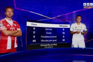 BBC統(tǒng)計凱恩、姆巴佩本賽季數(shù)據(jù):