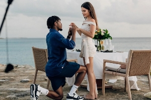 姆班古拉為女友戴上了一枚上面有水滴形狀的鉆戒。
