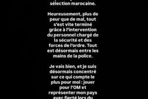 “幸運的是,驚嚇大于傷害,事件在安保人員和執(zhí)法部門的及時介入下迅速平息。目前一切已交由警方處理。我現(xiàn)在很好,也已將注意力重新放在最重要的事情上:為馬賽效力,并在即將到來的國家隊集訓中自豪地代表祖國出戰(zhàn)。”