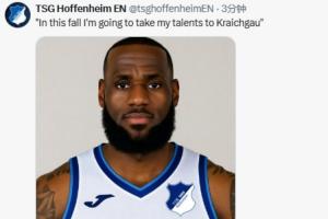 而德甲霍芬海姆也借機(jī)在社媒玩了一把梗。他們的英文社媒賬號曬出詹姆斯身穿霍芬海姆球衣的P圖照片,并配文道:“這個秋天,我將把天賦帶到克萊希高(霍芬海姆所在地)?!?/p>