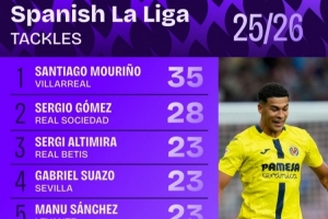 體育資訊10月7日訊 日前,Squawka統(tǒng)計了本賽季西甲搶斷次數(shù)排行,黃潛后衛(wèi)S-穆里尼奧35次居首。