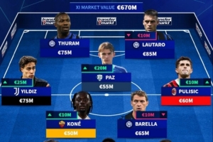 體育資訊10月8日訊 德轉(zhuǎn)更新了球員身價(jià)排名,意甲最貴首發(fā)11人也隨之出爐,國米的勞塔羅和圖拉姆領(lǐng)銜鋒線,AC米蘭球員普利西奇入選。