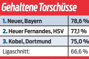 體育資訊10月8日訊 《體育圖片報(bào)》統(tǒng)計(jì)了本賽季門將在德甲聯(lián)賽中的撲救成功率,并列出前三名榜單,拜仁39歲門將諾伊爾以78.6%居首。