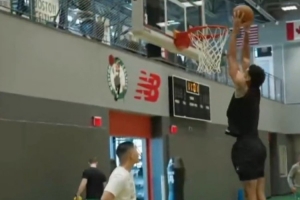由視頻可見(jiàn),塔圖姆已經(jīng)可以在原地起跳完成雙手扣籃,塔圖姆配文寫(xiě)道:“一定是鞋子的原因????。”
