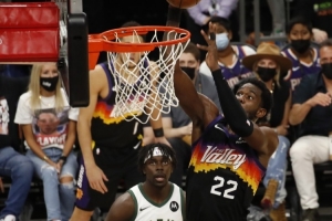 2021年總決賽,艾頓場(chǎng)均14.7分12籃板1.5蓋帽,布克場(chǎng)均28.2分3.5籃板4助攻,保羅場(chǎng)均21.8分2.7籃板8.2助攻。