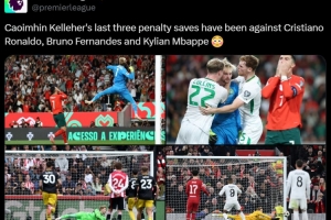 體育資訊10月12日訊 英超官方發(fā)布數(shù)據(jù),凱萊赫近3次撲點(diǎn)分別撲出了C羅、 B費(fèi)和姆巴佩的點(diǎn)球。