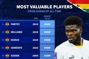 體育資訊10月13日訊 德國(guó)轉(zhuǎn)會(huì)市場(chǎng)列出加納球員歷史最高身價(jià)排名,托馬斯、伊納基-威廉姆斯、庫(kù)杜斯5000萬歐居首。