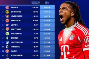 德甲各隊身價排名:拜仁9.52億歐遙遙領先 多特蒙德5.01億歐第二