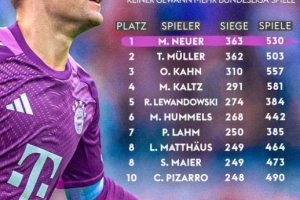 體育資訊10月19日訊 德甲第7輪比賽,拜仁在安聯(lián)球場(chǎng)以2-1的比分力克多特笑傲國(guó)家德比。本場(chǎng)比賽,拜仁門將諾伊爾迎來自己第530場(chǎng)德甲比賽,而他也取得了第363場(chǎng)勝利,這讓他超越穆勒成為德甲勝場(chǎng)數(shù)最多球員。