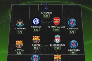 后衛(wèi):特里皮爾(紐卡,7.90分)、比塞克(國米,8.12分)、加布里埃爾(阿森納,8.08分)、努諾-門德斯(巴黎,8.78分)