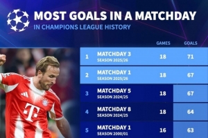 體育資訊10月23日訊 德國轉會市場統(tǒng)計了歐冠單輪比賽進球數(shù)量,并列出歐冠歷史單一輪次進球排名,本輪歐冠打進71球居首。