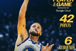 全場比賽庫里25中14、其中三分12中6,轟下42分6板7助1帽,下半場28分,包括關鍵時刻連得球隊的16分。