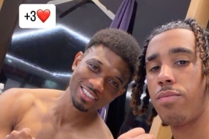 約羅也在賽后通過社媒曬出自己和阿瑪?shù)略谫惡蟾率页嗦闵习肷淼淖耘恼?,兩人看起來都相?dāng)開心,約羅還配文道:“+3分”。