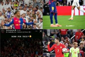國家德比賽前,亞馬爾曬客場(chǎng)4-0皇馬照片,最終巴薩1-2不敵皇馬。