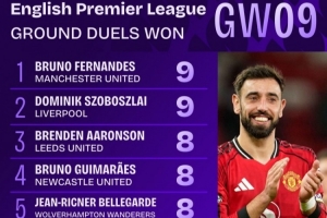 體育資訊10月28日訊 英超聯(lián)賽第9輪已經(jīng)完賽,數(shù)據(jù)機(jī)構(gòu)squawka統(tǒng)計了本輪地面對抗成功次數(shù),曼聯(lián)隊長B費和利物浦中場索博斯洛伊并列居首。