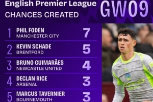 體育資訊10月28日訊 英超第9輪戰(zhàn)罷,據(jù)Squawka數(shù)據(jù)統(tǒng)計,福登是本輪創(chuàng)造機(jī)會次數(shù)最多的球員,共計7次。